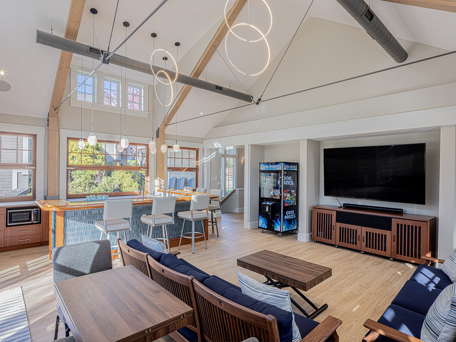 CEO Jim Madigan enjoyed reminiscing with his old St. John’s classmate Bill Masiello about how well this project ran and how beautifully Bill’s creative, stunning vision came to fruition. Former project manager Tim Canada and retired superintendent for the job Serge Dias were in attendance to proudly recount the difficulties they overcame and the wonderful relationship they shared with the Halls throughout the process. During the afternoon, Bruce had compiled progress photos and videos that looped continuously on various TV screens in the recreation building, so that everyone could see the incredible feat of this project, especially the installation of the underground professional grade bowling alley.