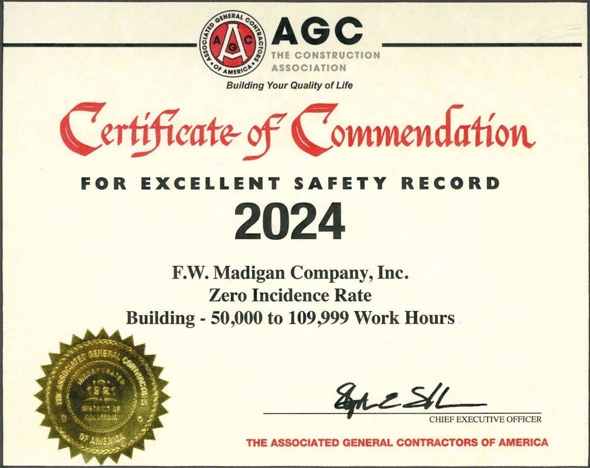 F.W. Madigan Company Receives Prestigious 2024 AGC National Safety Award