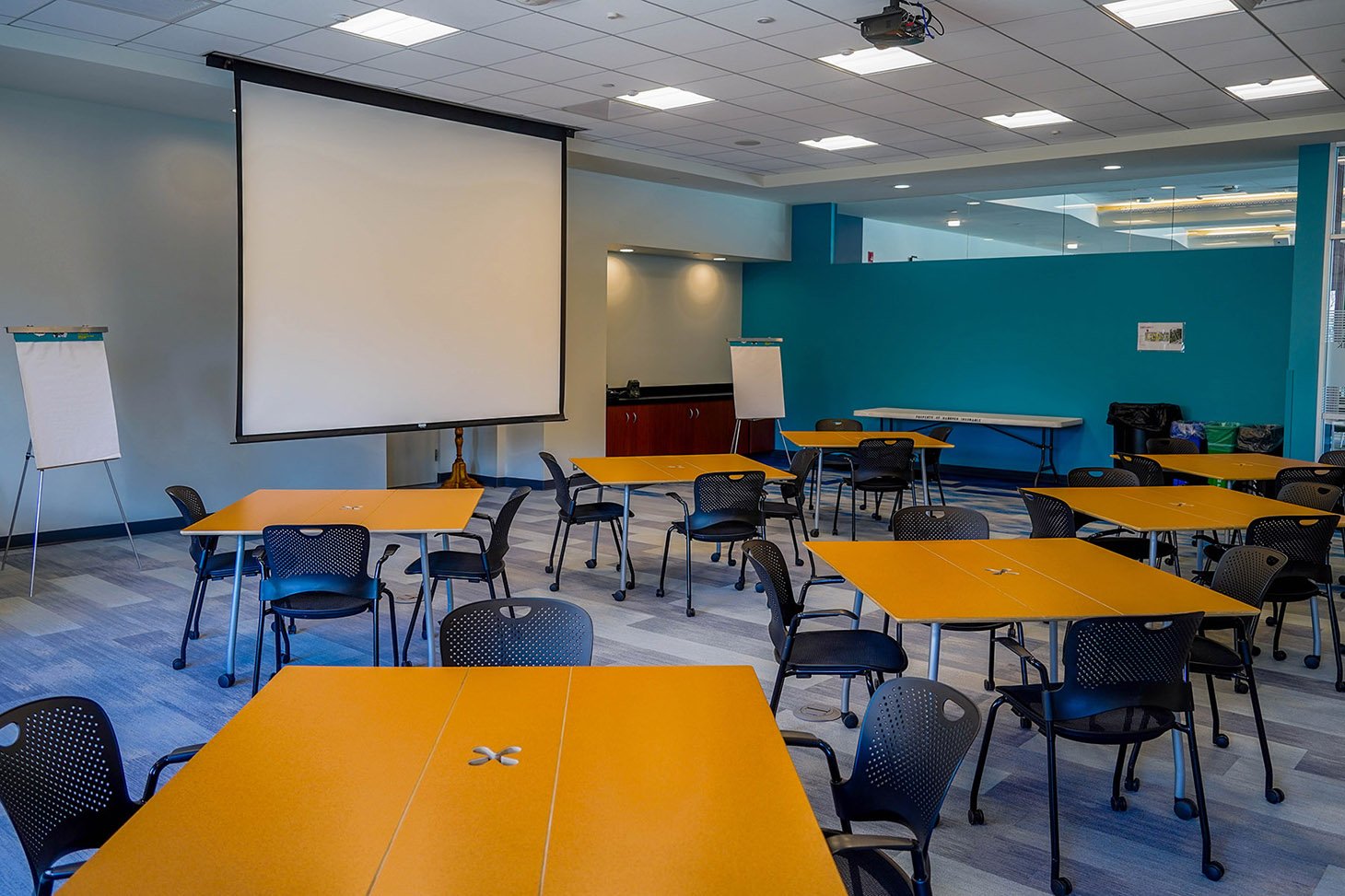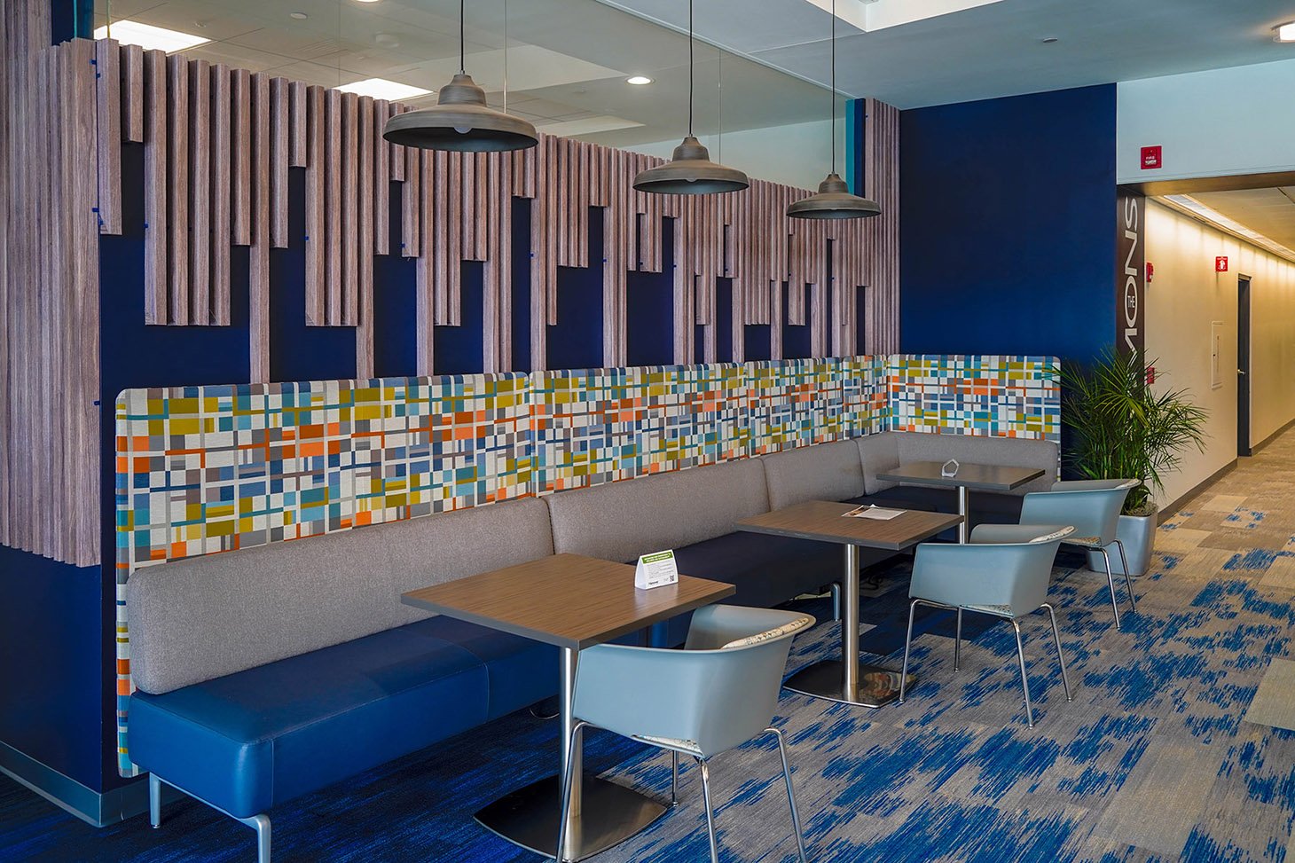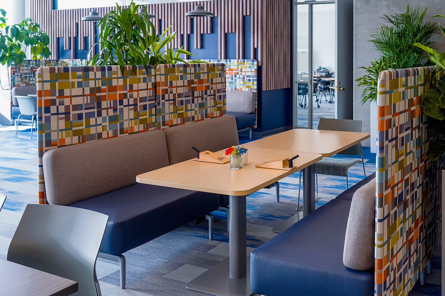 Madigan was contracted by The Hanover Insurance Group to provide a cosmetic upgrade to their existing cafeteria space. Since the COVID-19 pandemic, many larger businesses have transferred over to a permanent hybrid work schedule for their staff, with time split between working at home and the office. Hanover decided to take the opportunity presented with this new schedule to modernize their current dining space, adding different pops of color and feature elements. The intention of this modernization was to provide a space where employees could work collaboratively away from their desks in a welcoming environment, with the space being set up in a more café-style manner. The focus of the space is around the Community Table, set on an LVT floor and complemented with contemporary pendant lighting as well as both in-floor and in-table power sources. There is also a graphic feature wall separating the cafeteria space from an adjacent recording studio.